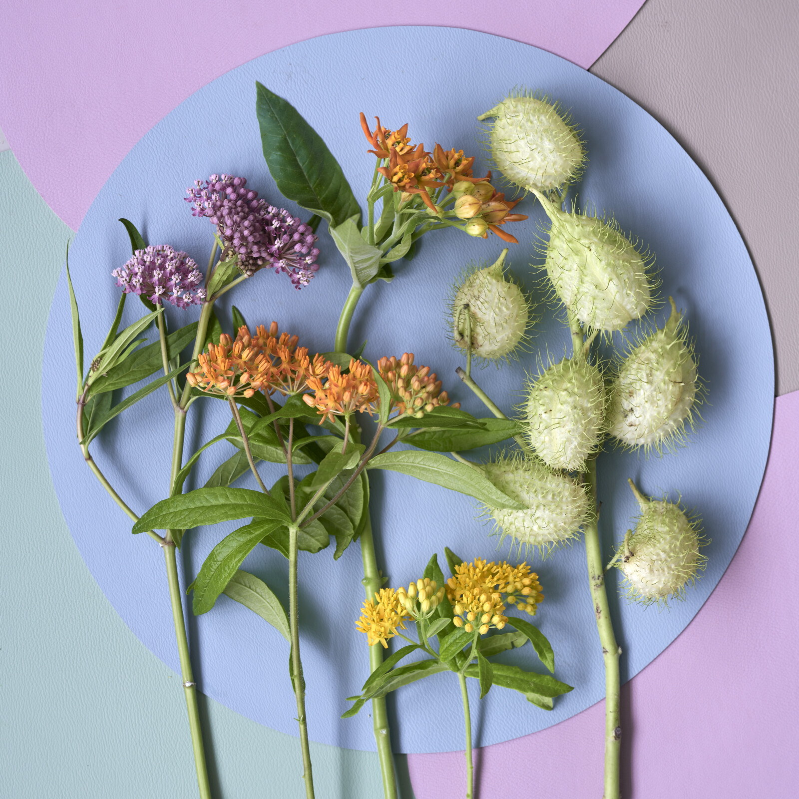 Asclepias is een mooie verfijnde bloem en voegt een kleurrijk en levendig element toe aan bloemstukken. De Asclepias physocarpa heeft met zijn lichtgroene 'harige ballen' een bijzondere decoratieve waarde.