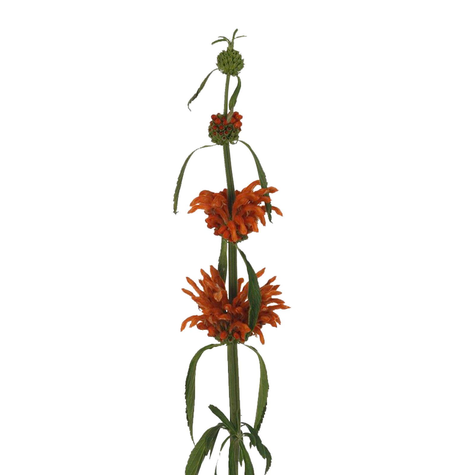 De Leonotis leonurus bloeit met kransen van feloranje, buisvormige bloemen die in etages rond de stengel groeien. De structuur is uitgesproken en geeft boeketten hoogte. De bloemen hebben een fluweelachtige textuur en een warme uitstraling.