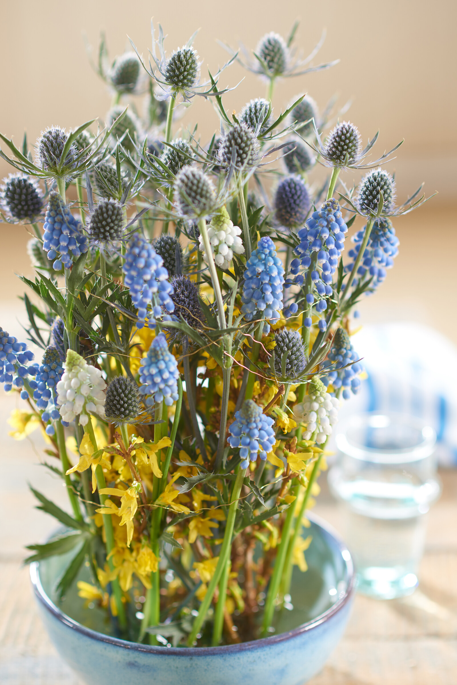 De Muscari is houdbaar bloemetje die het als monobosje heel mooi doet op de vaas.