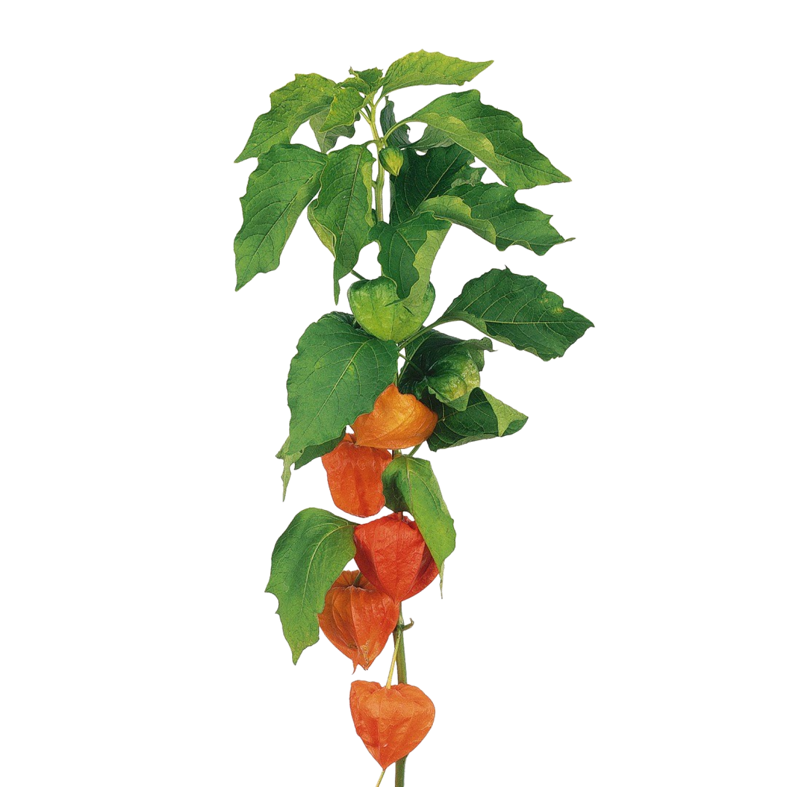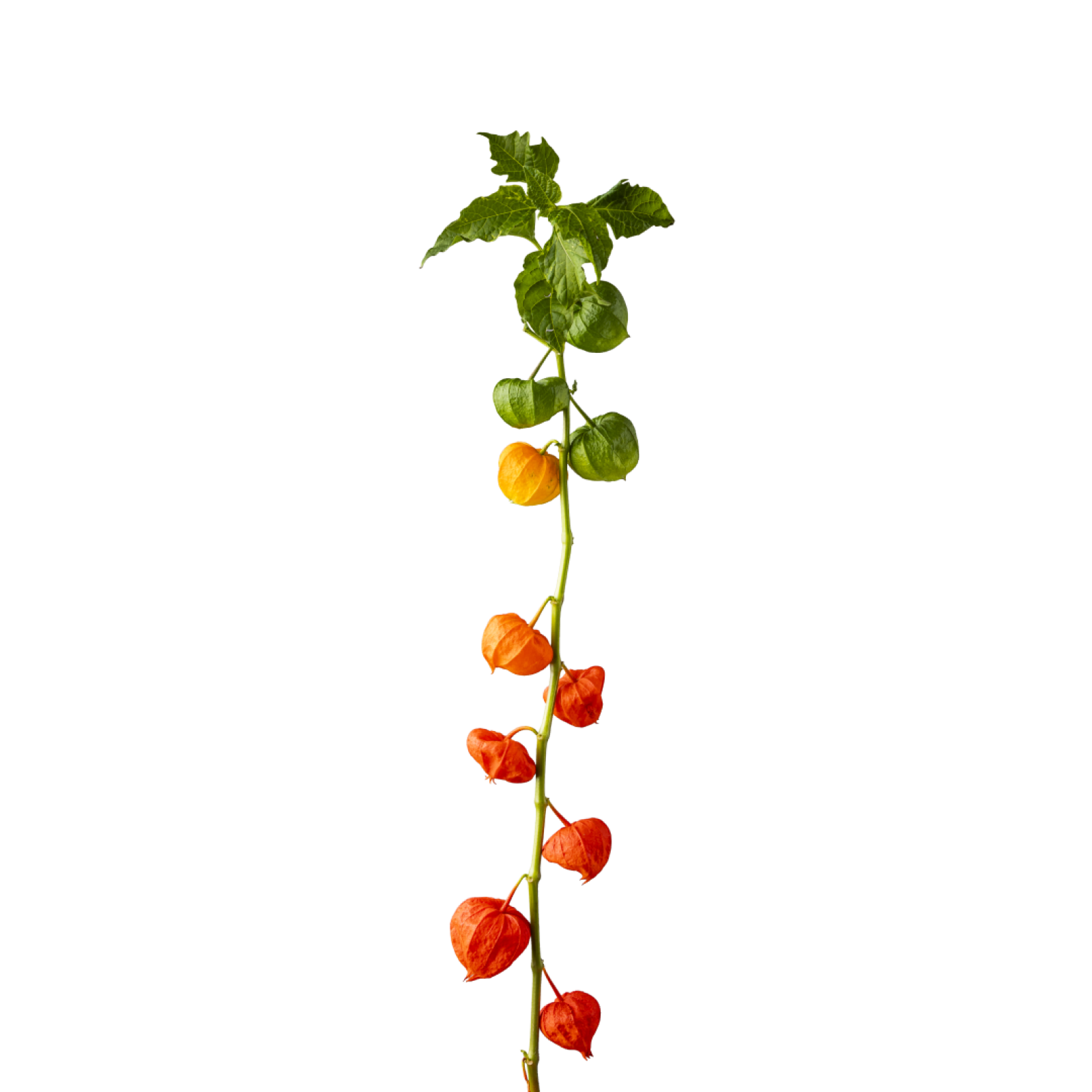 De Physalis heeft een frisgroene steel met daaraan lampionnetjes in de kleur oranje.