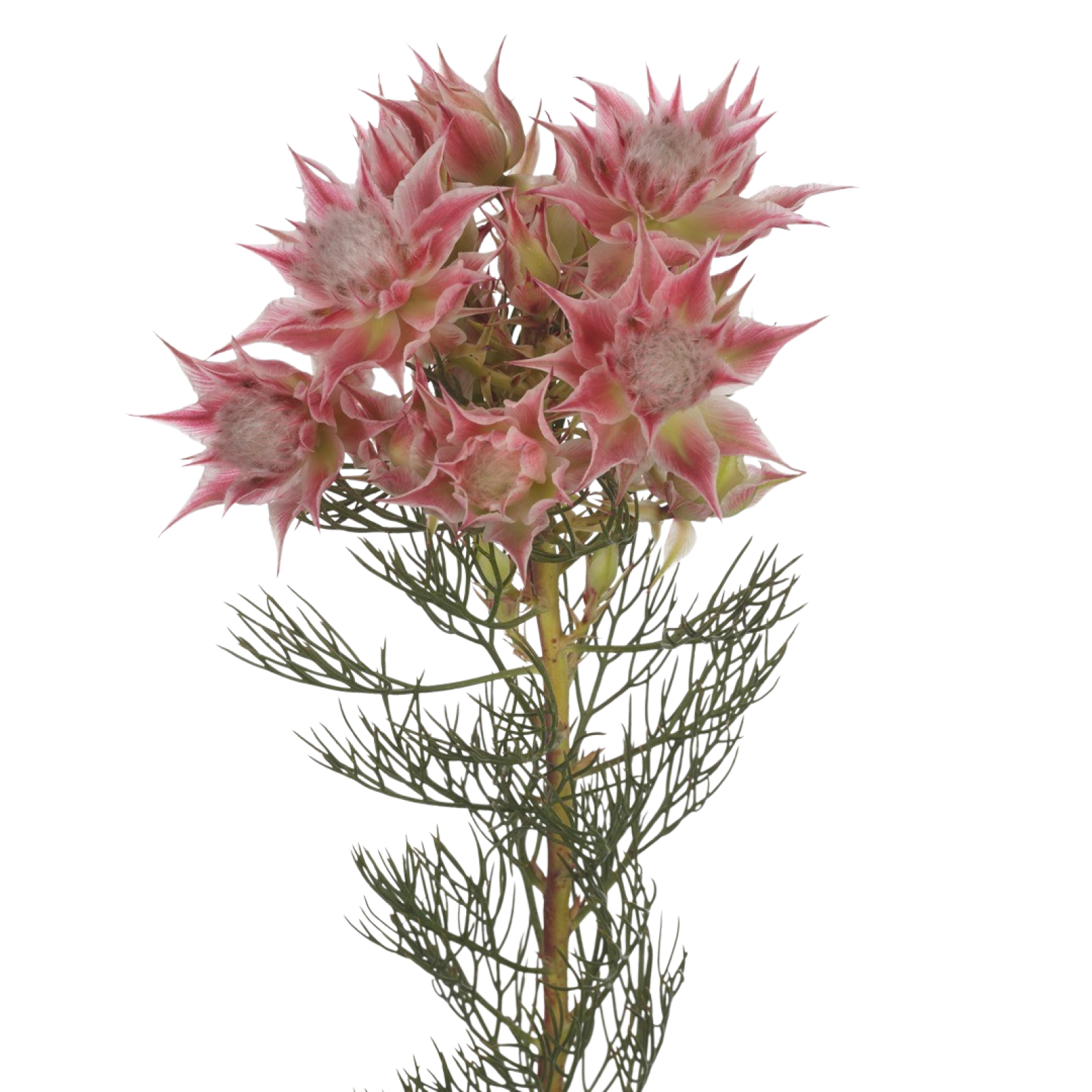 De Serruria heeft ivoorkleurige vloemen met roze accenten. In het hart van de bloem zitten kleine rood/roze blaadjes.