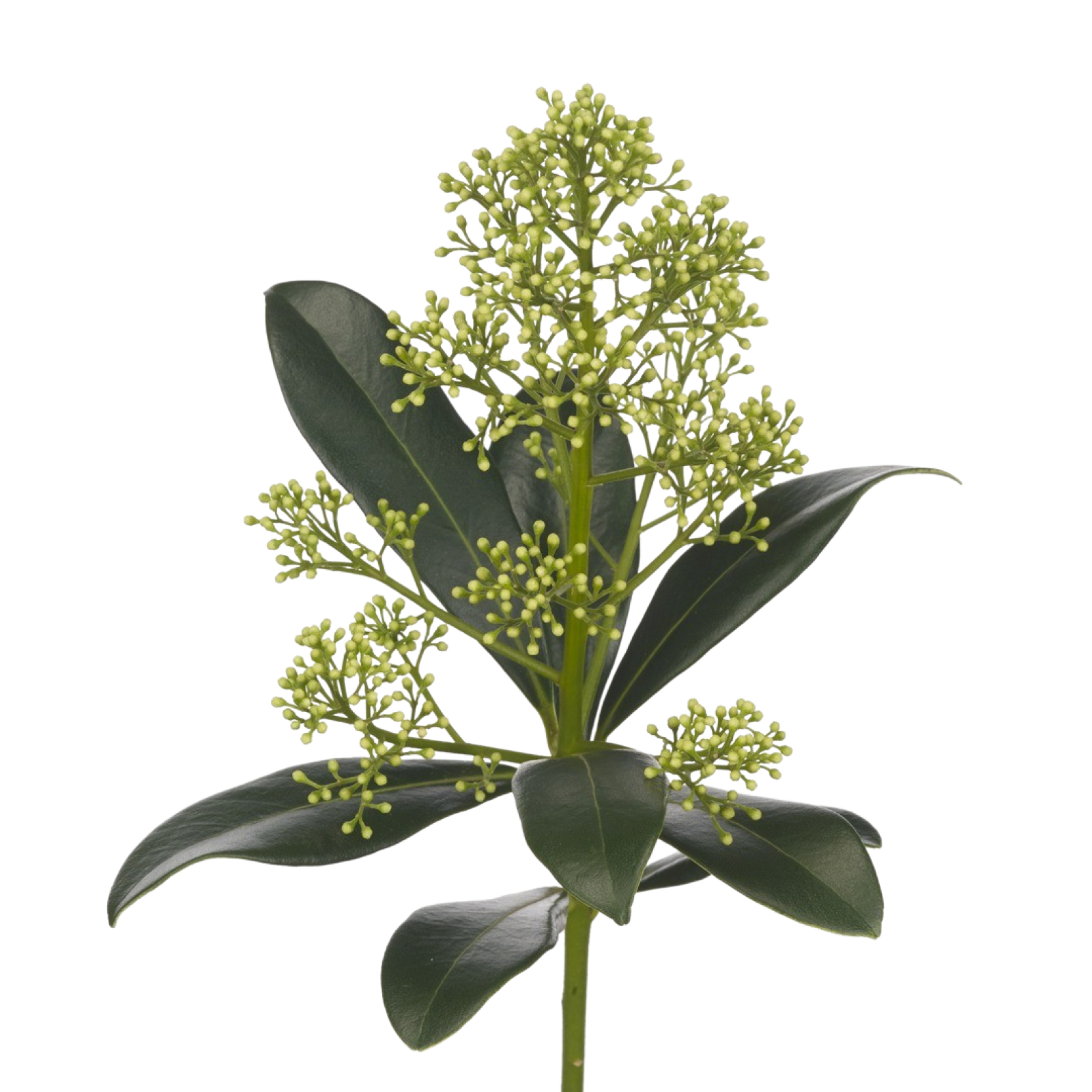 Een Skimmia heeft een cluster van kleine bloemknoppen, bloemetjes of bessen aan het einde van een houtige steel met daar omheen stevig groen blad.
