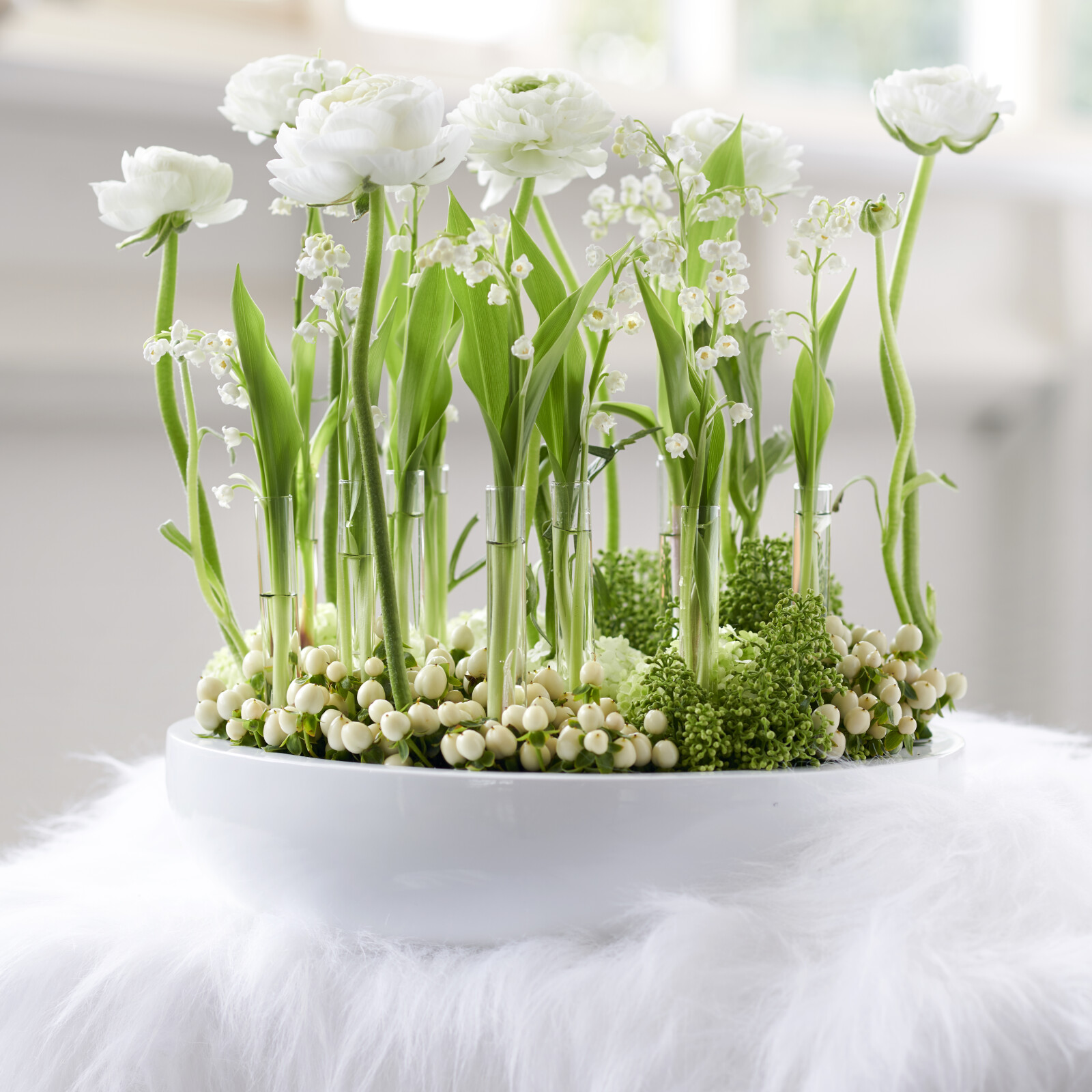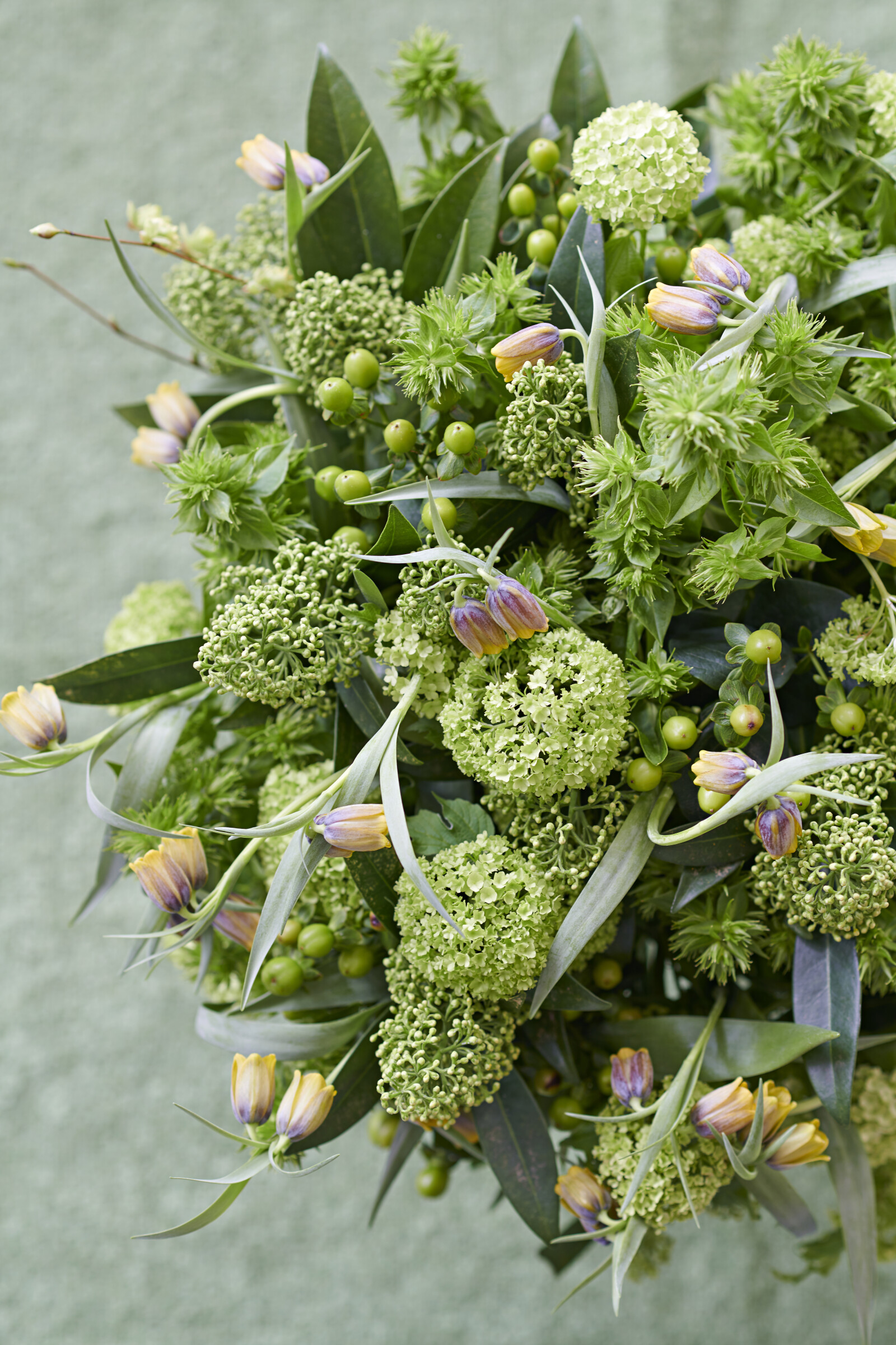 De Skimmia bloemknoppen en bloemetjes in de kleuren wit, lichtgroen en rood, warmrood. De bessen van de Skimmia zijn helderrood. Het blad van de Skimmia is donkergroen.