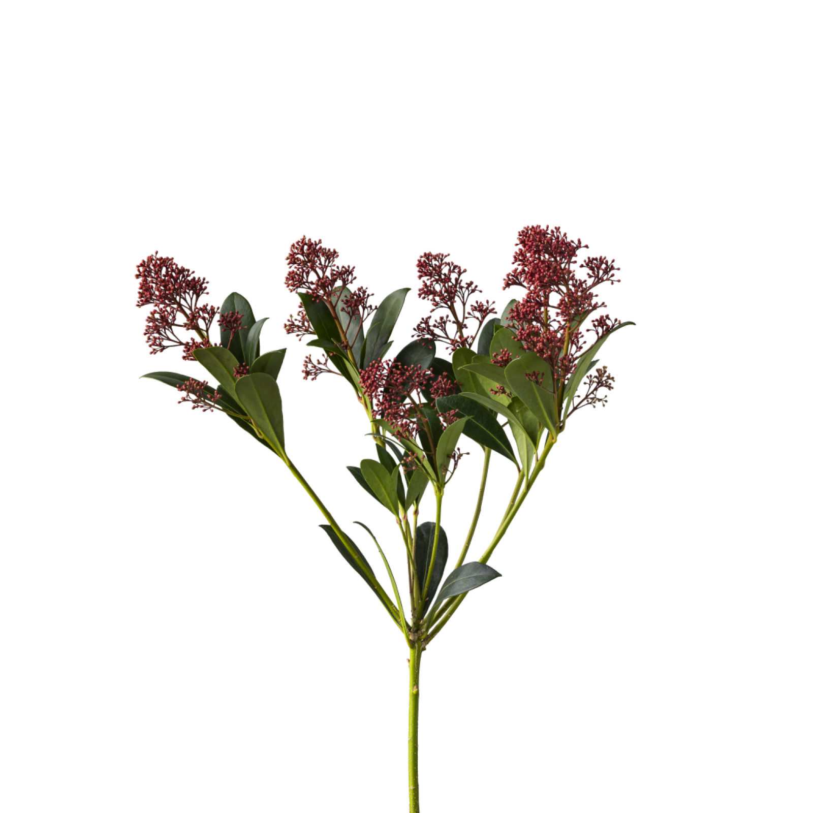 Een Skimmia heeft een cluster van kleine bloemknoppen, bloemetjes of bessen aan het einde van een houtige steel met daar omheen stevig groen blad.