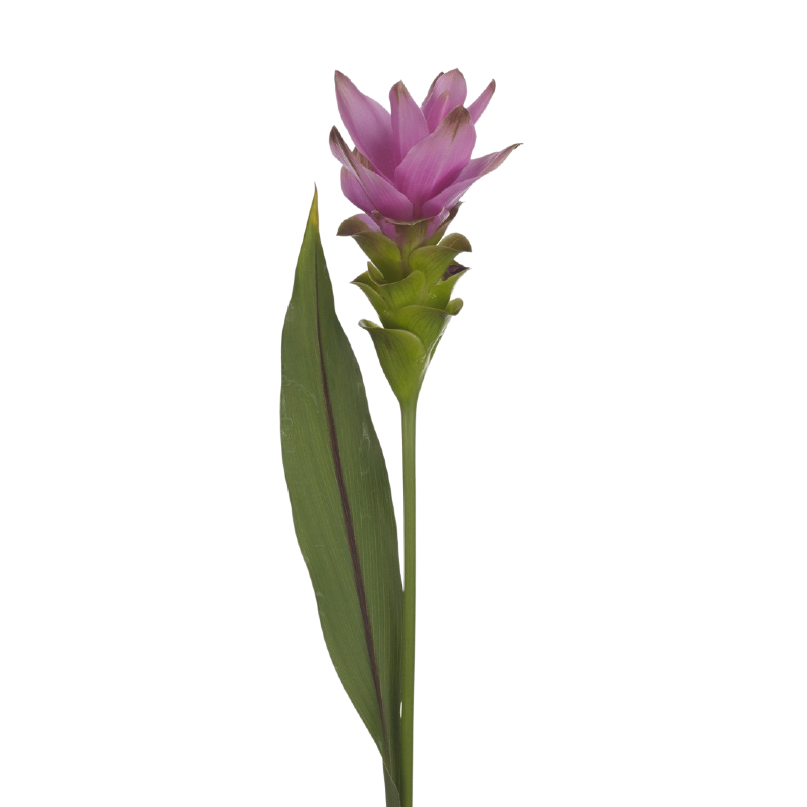 De Curcuma is een opvallende bloem met een exotische uitstraling. De roze/lila kleur zorgt voor een levendig en feestelijk element in een boeket of arrangement.