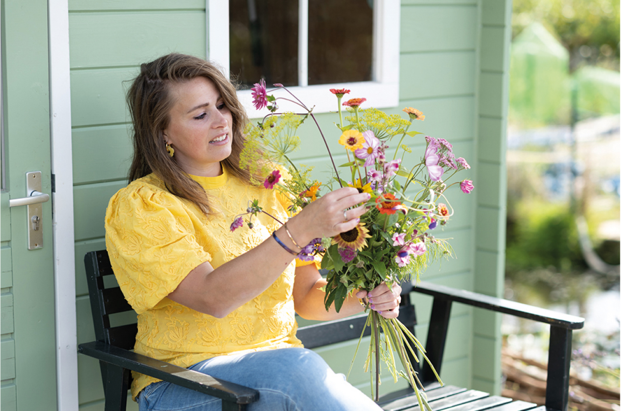Janneke van Es-Roeland uit Alblasserdam. Janneke wordt heel erg gelukkig van bloemen. “Een huis zonder bloemen of planten leeft voor mij niet; ik mis dan toch iets groens.” Ze doet zelf veel inspiratie op in de natuur en door de verandering van de seizoenen.