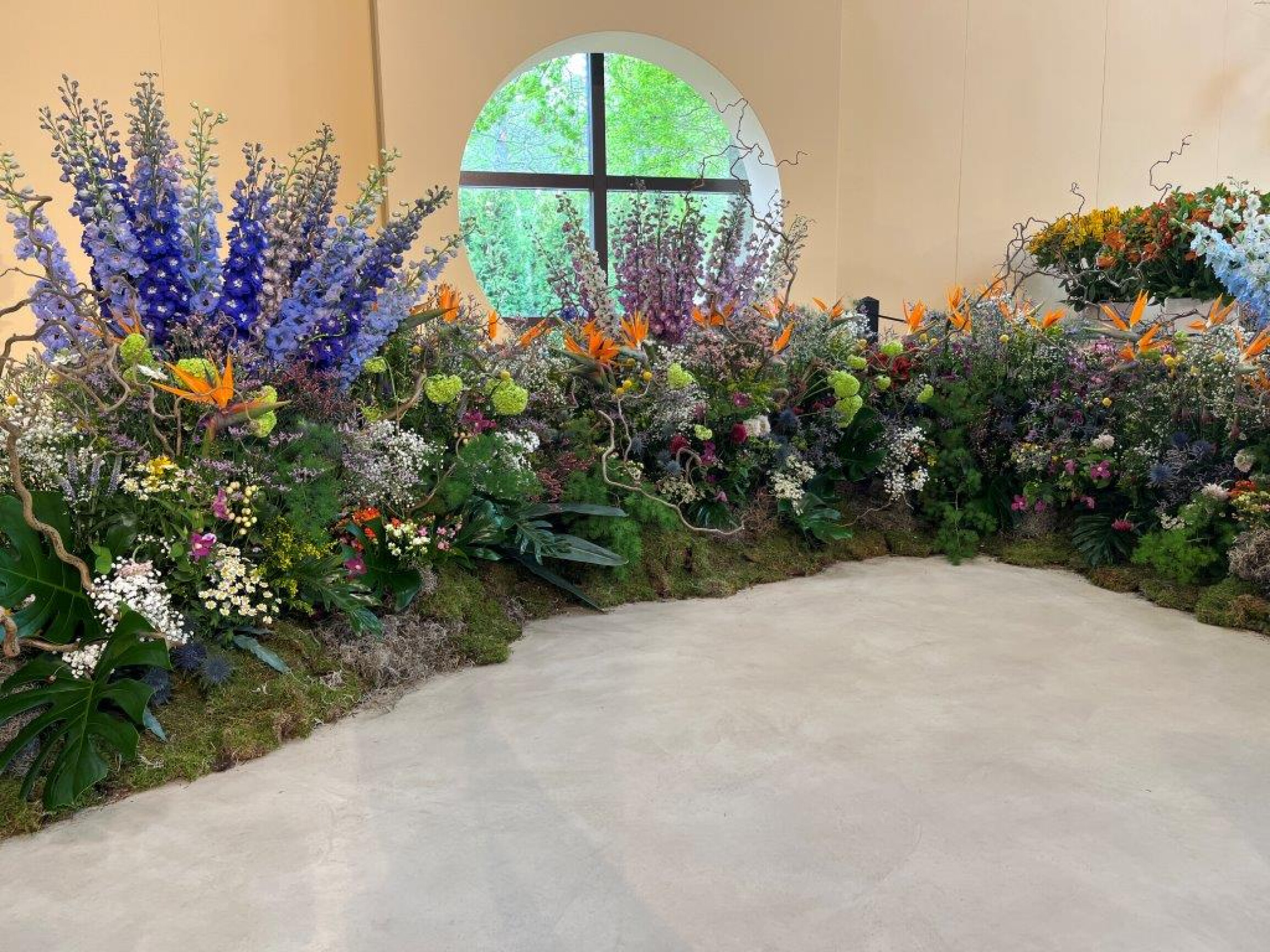 De volgende bloemen zijn t/m woensdag te bewonderen in het Oranje Nassau Paviljoen op de Keukenhof: Nigella Deep See Blue (Arend Jan Voskamp), Bouvardia roze en rood (Vreeken Bouvardia) Strelitzia bloemen (H. van Hemert BV), Een kleurrijke mix van dubbelbloemige Delphinium (N G Wigchert), Witte Astrantia, Eryngium, Daucus, Limonium in verschillende kleuren en Sanguisorba (Marginpar BV), een decoratief groen mix (Kwekerij Figaro) van Asparagus umbellatus, Monstera blad, Philodendron xanadu, Cyrtomium fortunei, Matricaria 'Single Vegmo' - Kamille (Grootscholten Matricaria), een breed Hypericum assortiment, Coco Bamboo groen, Coco Uno Wit, Coco Tiamo roze, Coco Tango rood en Veronica in de kleuren wit, blauw, donkerroze en lichtroze (Florius BV), Alchemilla M Robustica (Winbloom), Helenium Kanaria (SJM Nouland), diverse kleuren Kalanchoë (Queen Holland), Gyps, Limonium, Craspedia (Klaver Flowers), Phlox (Hogenboom Phloxen Kenya), en diverse kleuren Limonium Sinuatum (Samore Flower Farms Plc).